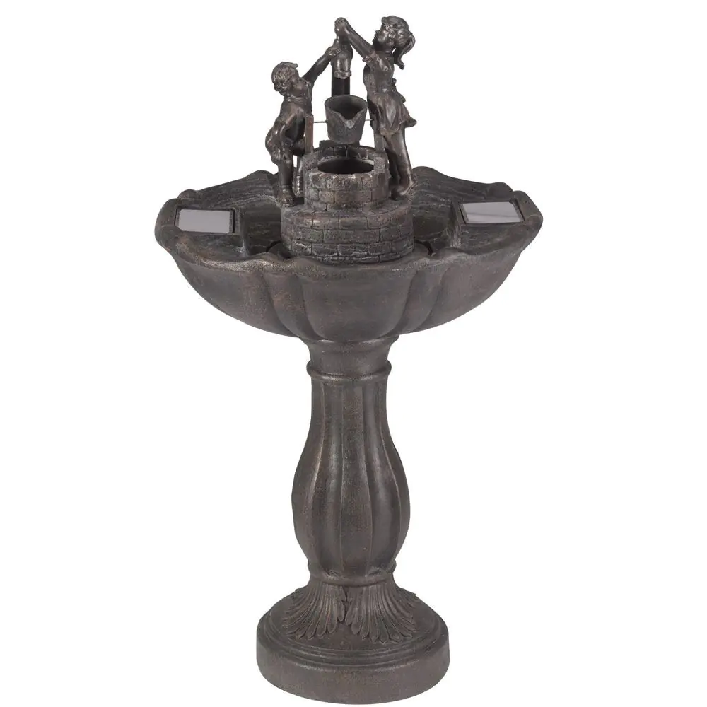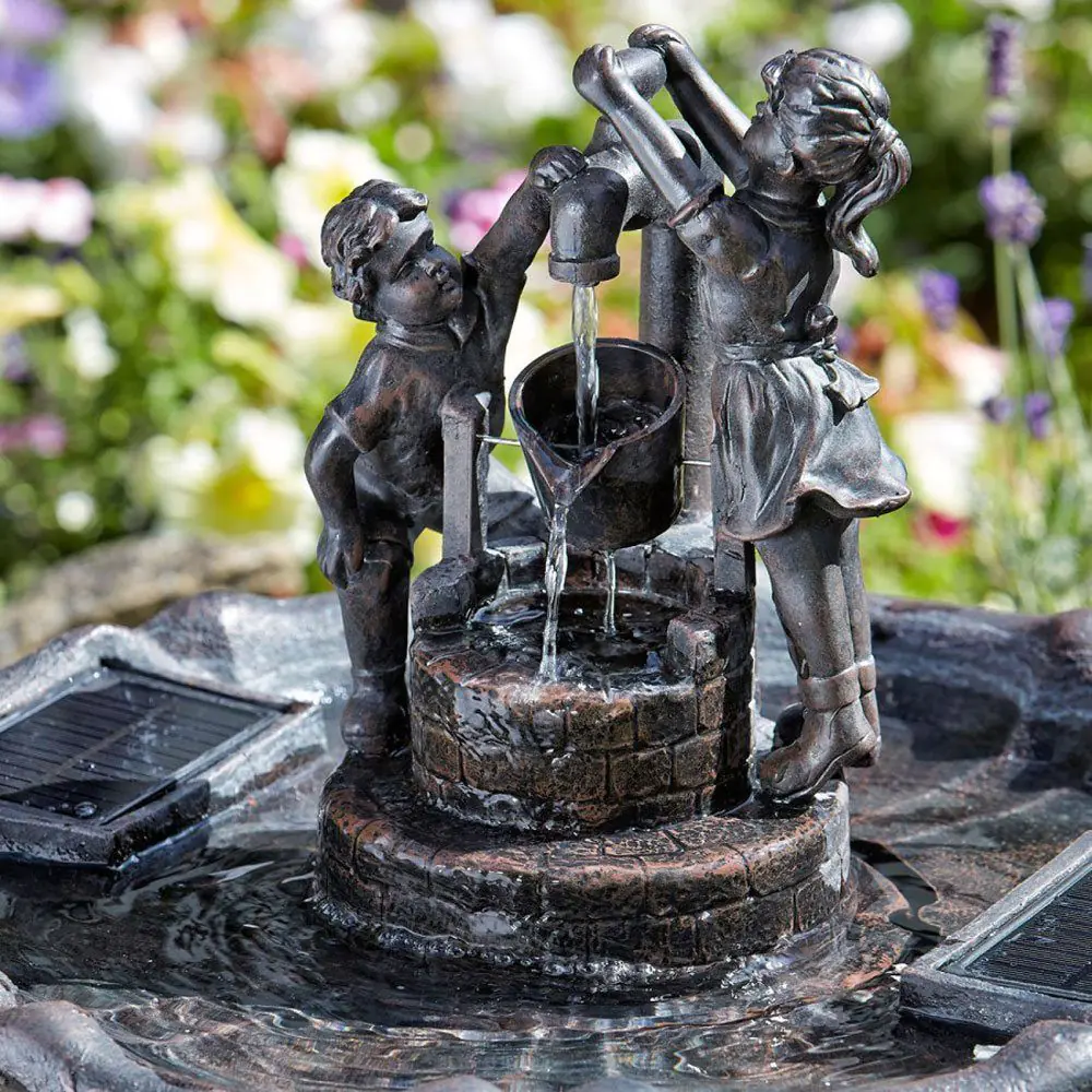 The Children with Tipping Bucket Solar Birdbath Fountain is a beautifully decorative feature depicts a traditional scene of a boy and girl playing with water at a well. Twin integrated solar panels power a pump which is hidden in a water chamber below the figures.